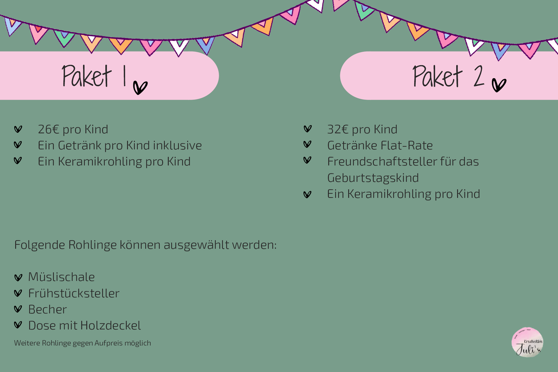 Ein Kindergeburtstag mit Keramikmalen verbindet kreativen Spaß für die Kinder mit entspannter Zeit für die Eltern. Die kleinen Künstler gestalten ihre individuellen Werke, die nach dem Brand nicht nur langlebig und glänzend sind, sondern auch als ganz besondere Erinnerungsstücke an diesen besonderen Tag dienen. Du kannst zwischen zwei Paketen wählen: